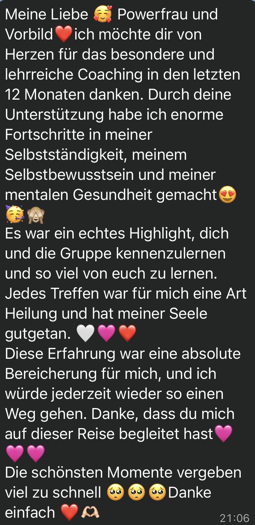 Trete die Reise zu dir selbst nicht alleine an, sondern connecte dich innerhalb des Coachings mit anderen beeindruckende Frauen, die motivieren & inspirieren. Zeige, warum Female Empowerment so mächtig ist. Tauscht euch in der Becoming Her Whatsapp Gruppe aus & lernt miteinander & voneinander.